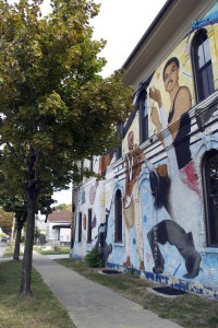 Hernandez designed the mural to show various African-American art forms from the past and present. But, an Italian artist told Hernandez that, as an artist, he should be an image in the mural–he looks out to the left with a dripping paintbrush in hand.