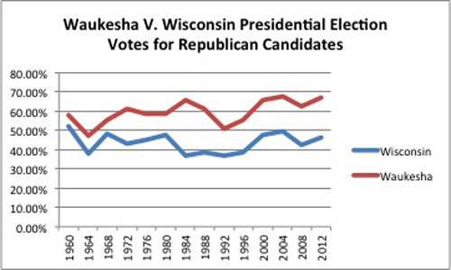 Waukesha’s voting patterns confirm this trend on a local level. Since the ‘60s, the county has grown more divorced from the opinions of the rest of the state. In 1960, almost 6 percent more people in Waukesha voted for the Republican presidential candidate than the rest of Wisconsin. By 2000, that number tripled to 18 percent, climbing to 21 percent in 2012.